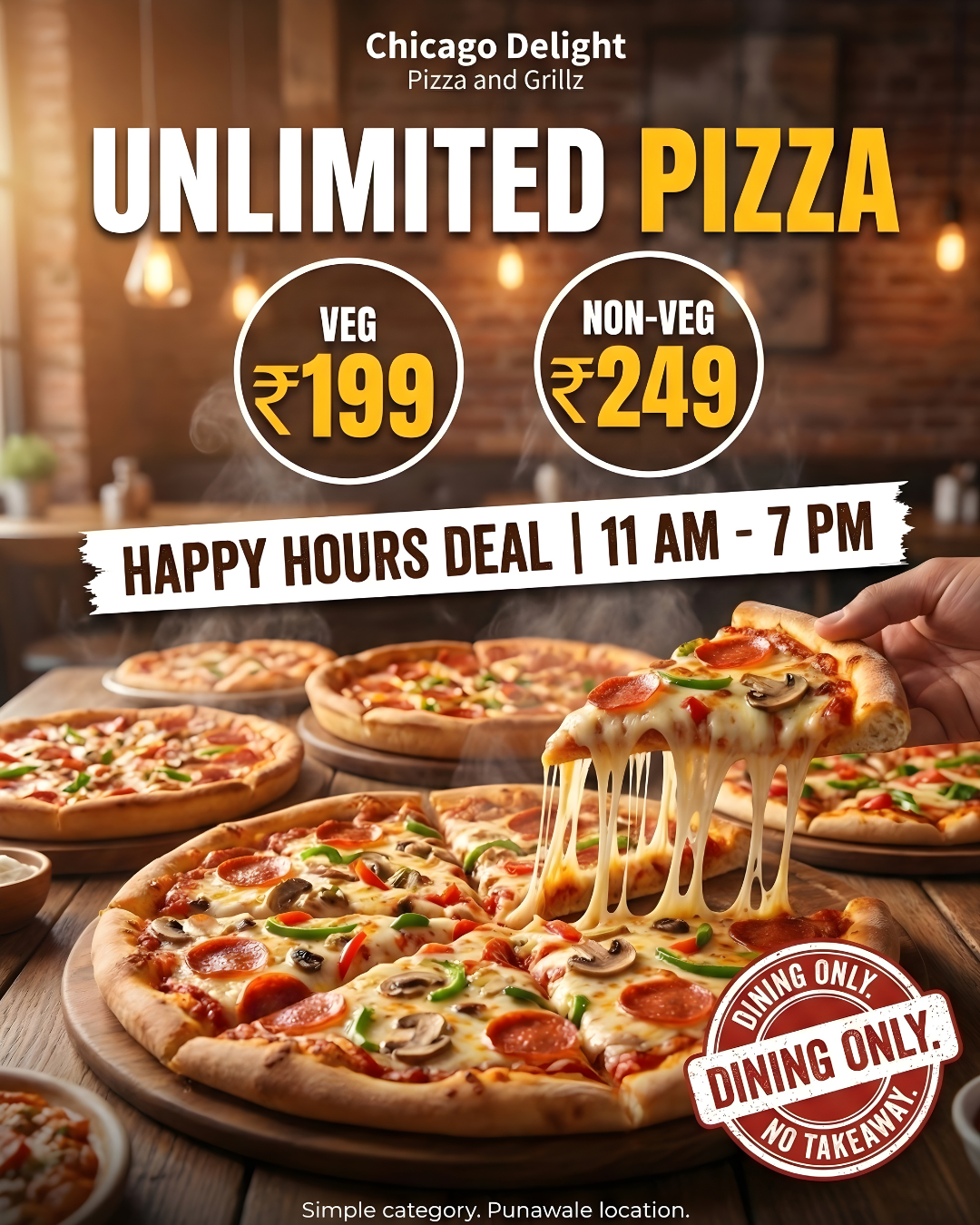 Chicago Delights Pizza & Grillz Cafe Punawale is your go-to destination for authentic Roman and Chicago-style pizzas, delectable Italian dishes, and quick fast-food options. Serving the vibrant Punawale and Pune community, we are dedicated to crafting flavorful meals using only the freshest ingredients. Our unique grillz selections and inviting cafe atmosphere, complete with expertly brewed coffee, set us apart as a local favorite. We prioritize culinary quality, quick service, and transparent pricing, ensuring a trusted and delightful dining experience for everyone. Whether you're craving a gourmet pizza or a satisfying meal, we deliver taste and convenience. Visit us or order online to discover your new favorite.